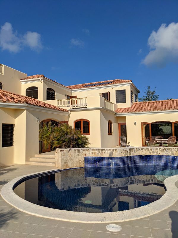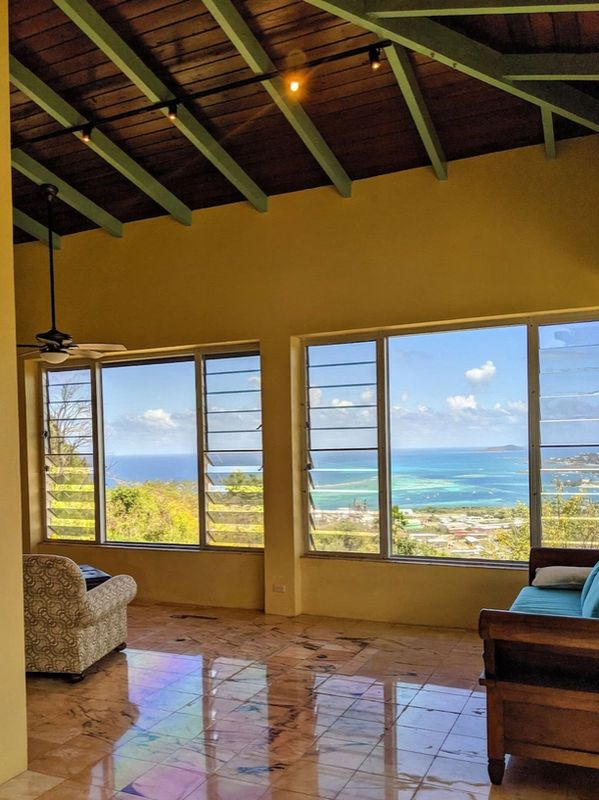 Gorgeous hilltop home with rare dual shore views! 3 bed 2.5 bath, with a garage. Huge sweeping views of both the North and South Shores, including Christiansted Harbor and Buck Island! Fantastic soaring ceilings with a wall of windows to enjoy the view and amazing breezes. Sit out by the private pool and soak in the beauty all around. Privacy abounds in this hilltop retreat, yet minutes to beaches, grocery stores, and downtown Christiansted.